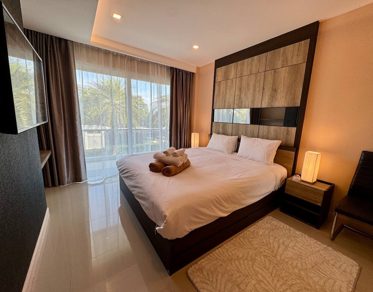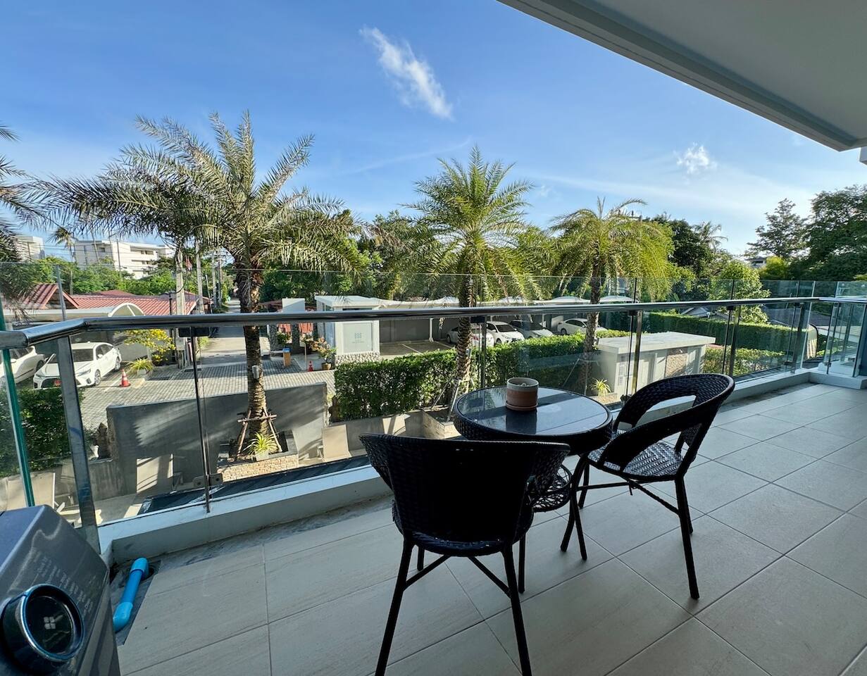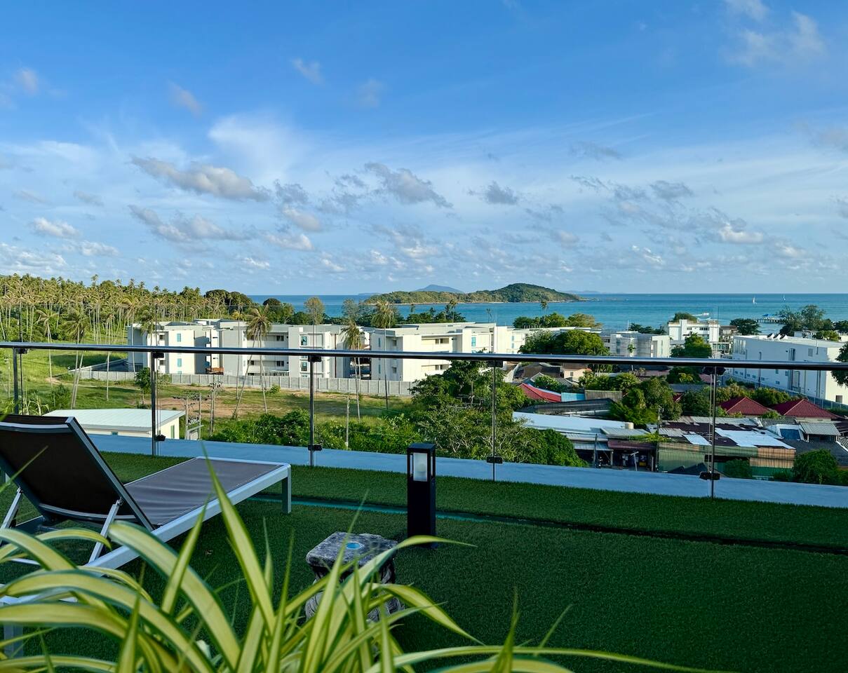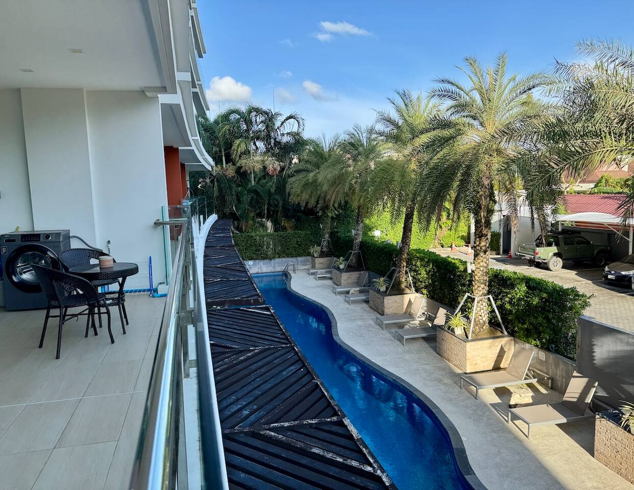 A modern 1-bedroom apartment at Babylon Sky Garden: a large terrace wrapped in palm trees and soft light. Overlooking the lush inner courtyard and swimming pool, and from the rooftop, endless sea views and sunsets. In Thai, “Kaya” means body, form, presence. This is a space for those who value mindful rest, intentional comfort, and the feeling of truly being in the moment.