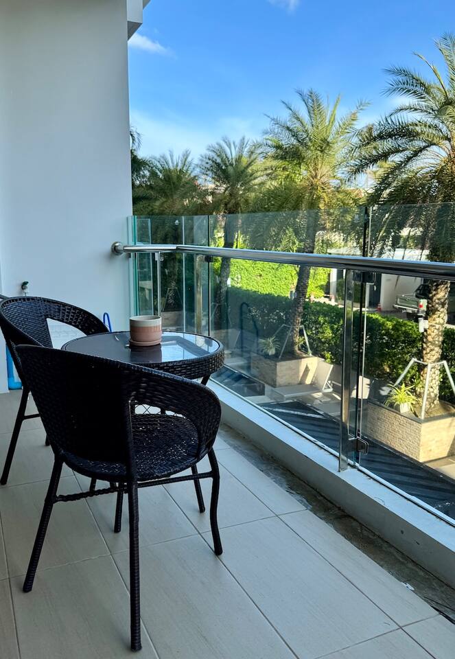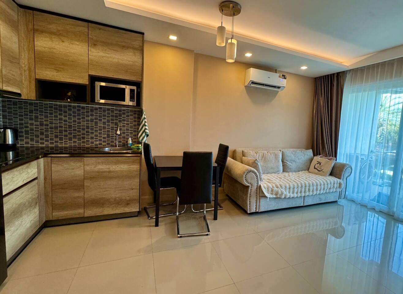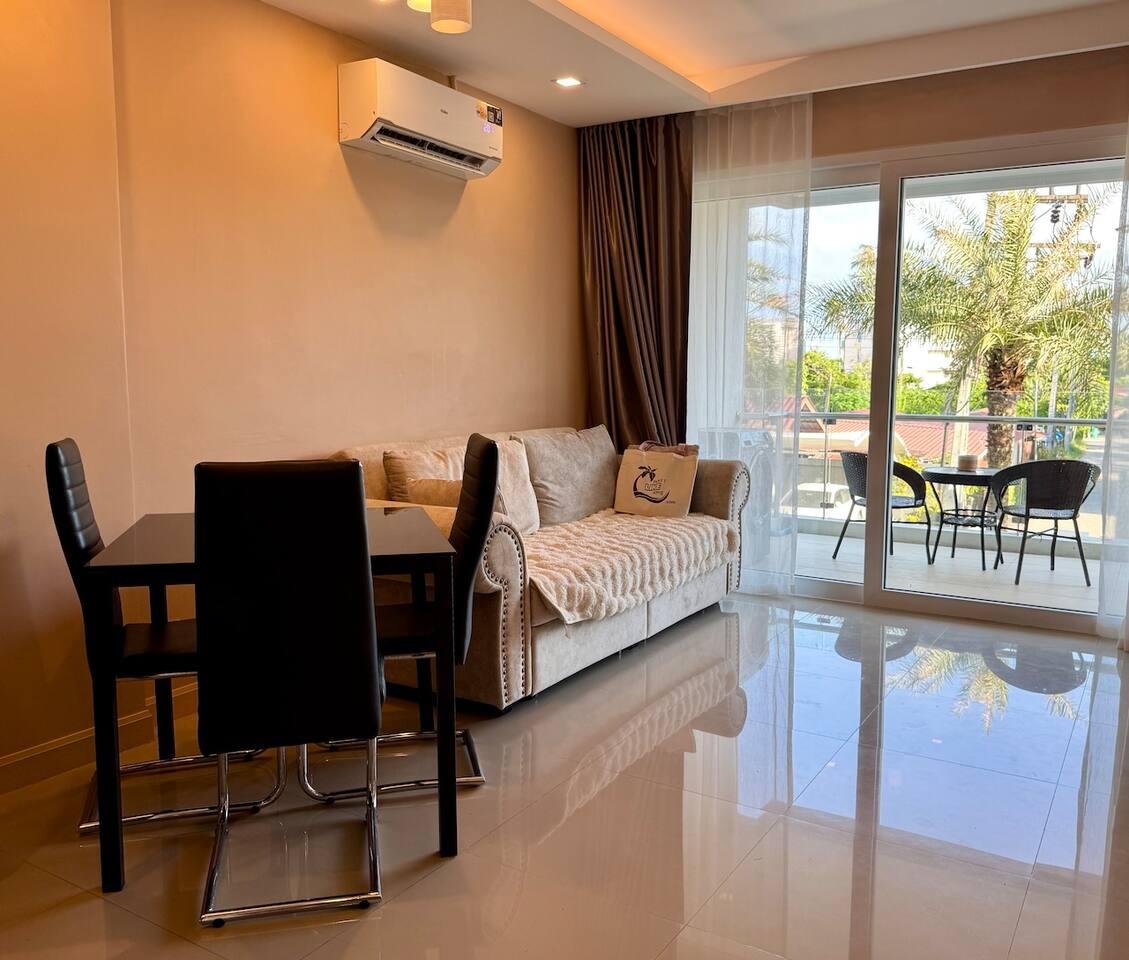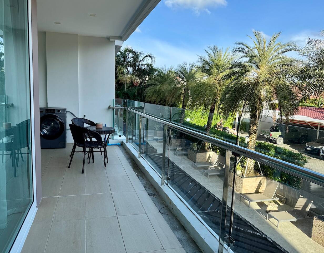 Spacious layout of 52 sqm Separate bedroom with a king-size bed Large living room with a sofa and access to the balcony Bathroom with two entrances: from the bedroom and the living room Fully equipped kitchen: stove, microwave, utensils Washing machine and dining table on the balcony View of the pool and tropical courtyard Air conditioning, Wi-Fi Second floor, elevator access