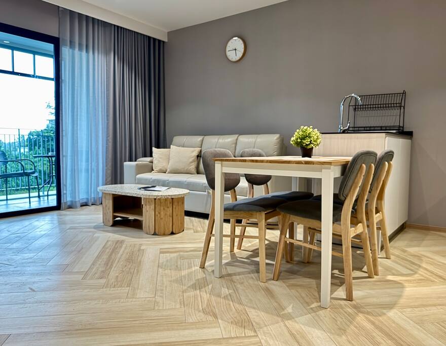 Апартаменты состоят из отдельной спальни, гостиной с выходом на балкон и полностью оборудованной кухни. В гостиной — большой раскладной диван, Smart TV, кофейный столик и обеденная зона. Кухня оснащена современной техникой: варочная панель, холодильник, микроволновая печь, посудомоечная машина и чайник. В спальне установлена двуспальная кровать king size, гардероб и сейф. Ванная комната оборудована душем и современными удобствами. С балкона открывается живописный вид на горы, установлена уличная мебель. Для удобства гостей — стиральная машина и отдельный Wi-Fi.