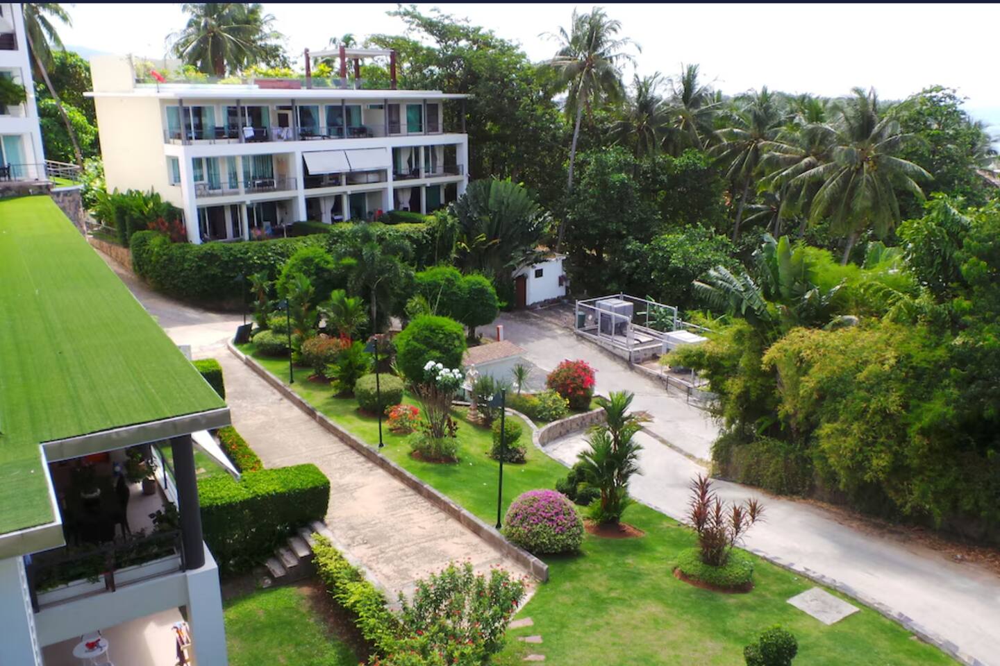 Full access to the apartment (approx. 120 m²) Private terrace with panoramic views of the sea and tropical gardens Two swimming pools: a central curved pool and a smaller waterfall pool Covered parking Elevator from the parking level On-site gym, seasonal restaurant, and shuttle bus (in high season)