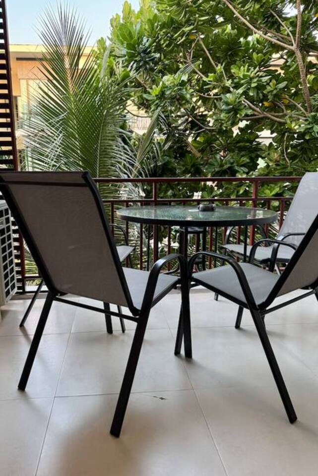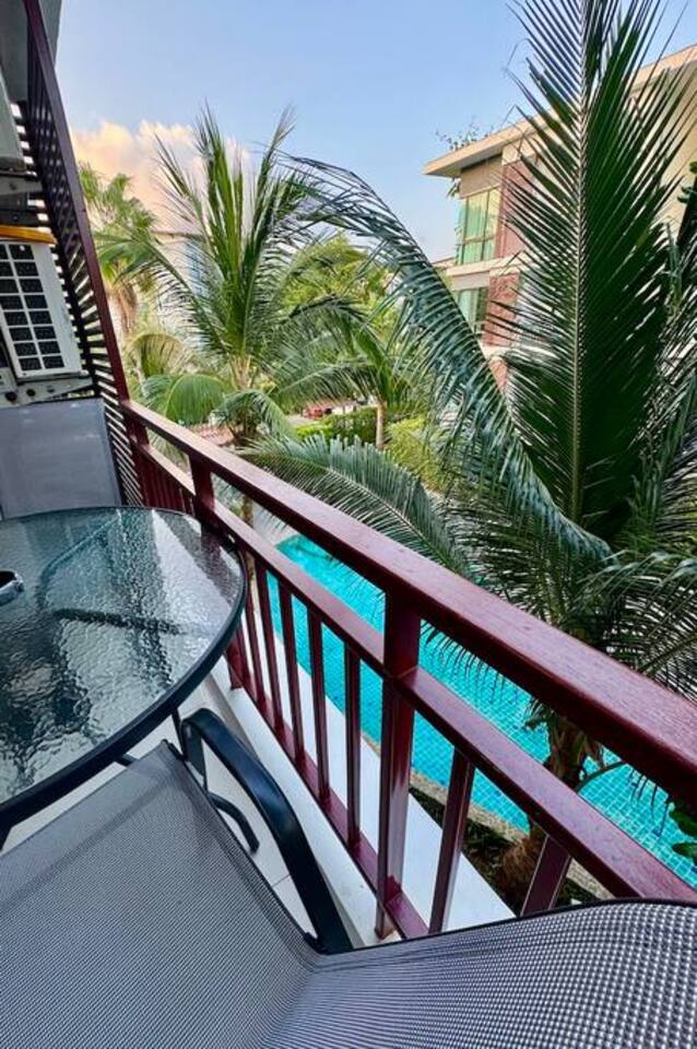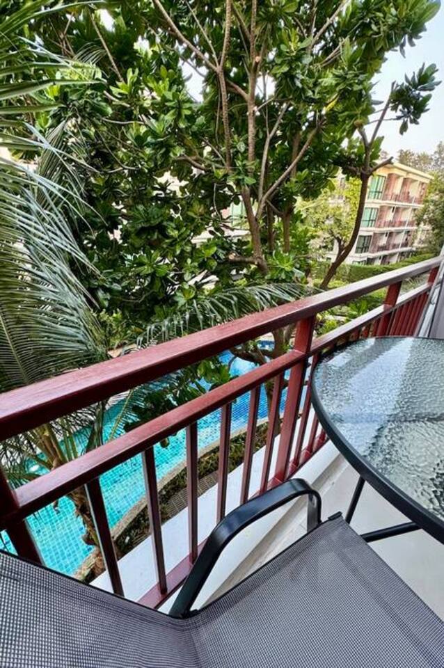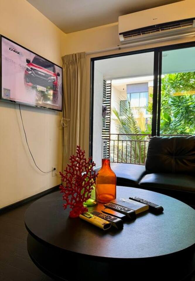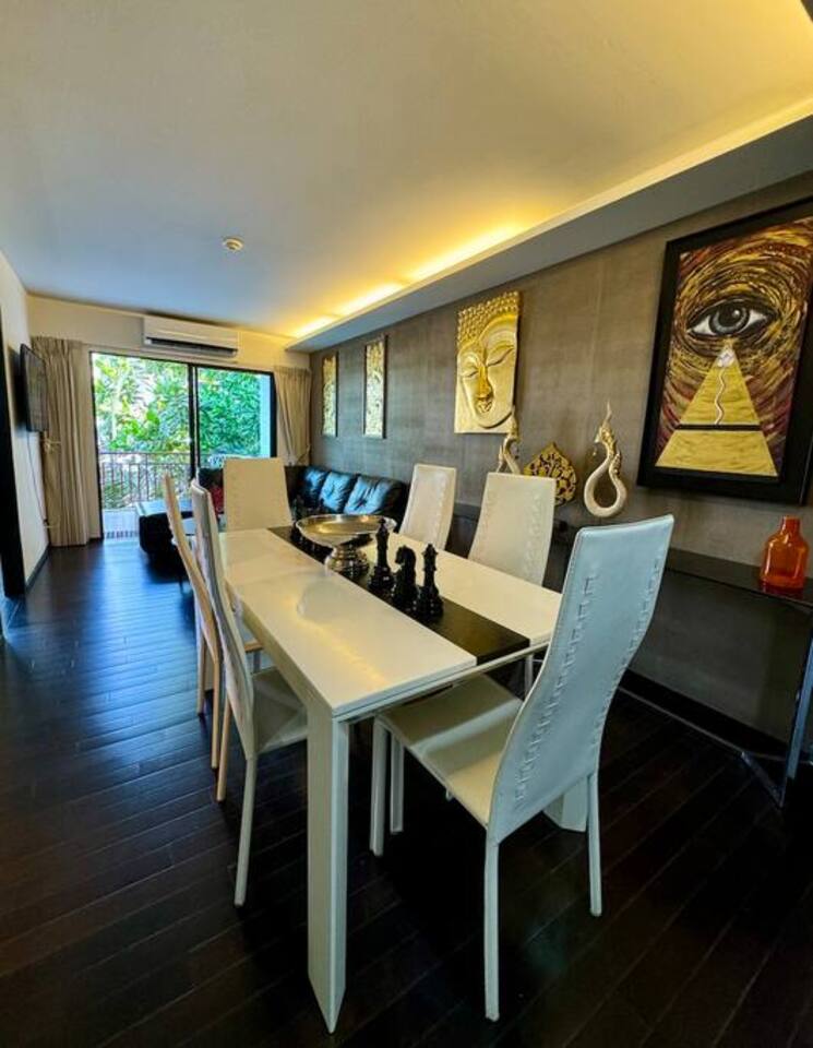 The apartment comfortably accommodates a family of four or five. The open-plan living room features a soft sofa, a Smart TV, a dining table, and a fully equipped kitchen. Both bedrooms are furnished with double beds in calm tones. The main bathroom includes a shower cabin, and there is also a guest toilet accessible from the living area. A spacious terrace with outdoor furniture is perfect for enjoying morning coffee or a glass of wine in the evening while overlooking the pool and gardens. A washing machine is also provided. The apartment is well-maintained, decorated with art pieces in Thai style, and furnished with quality items, creating a welcoming and homely space.