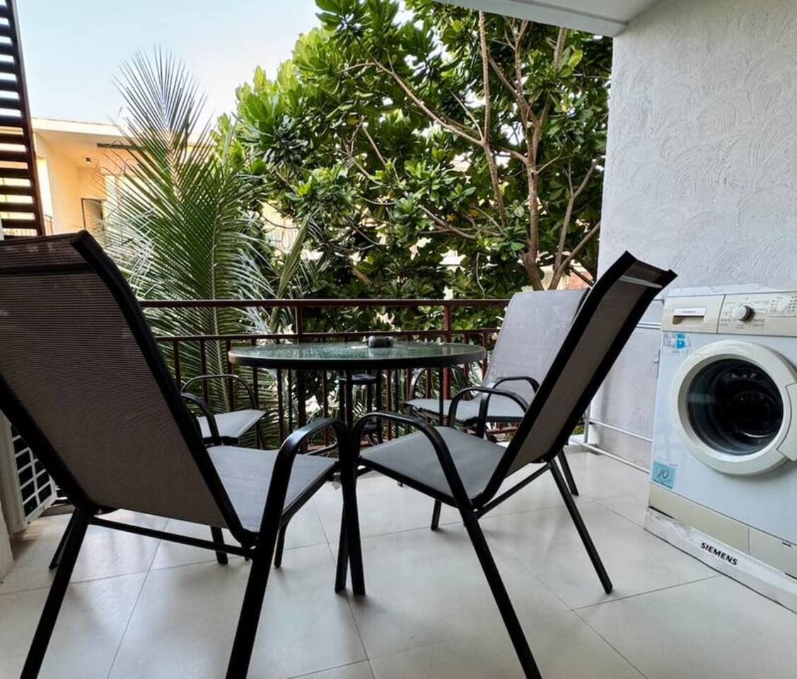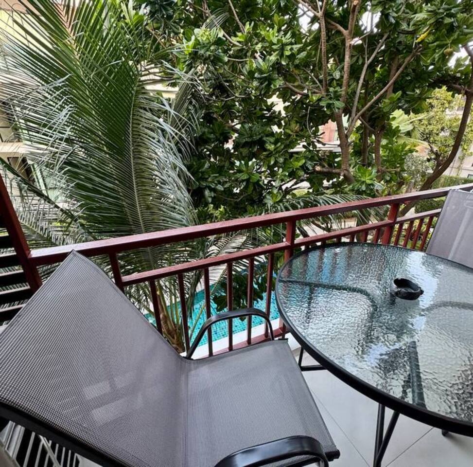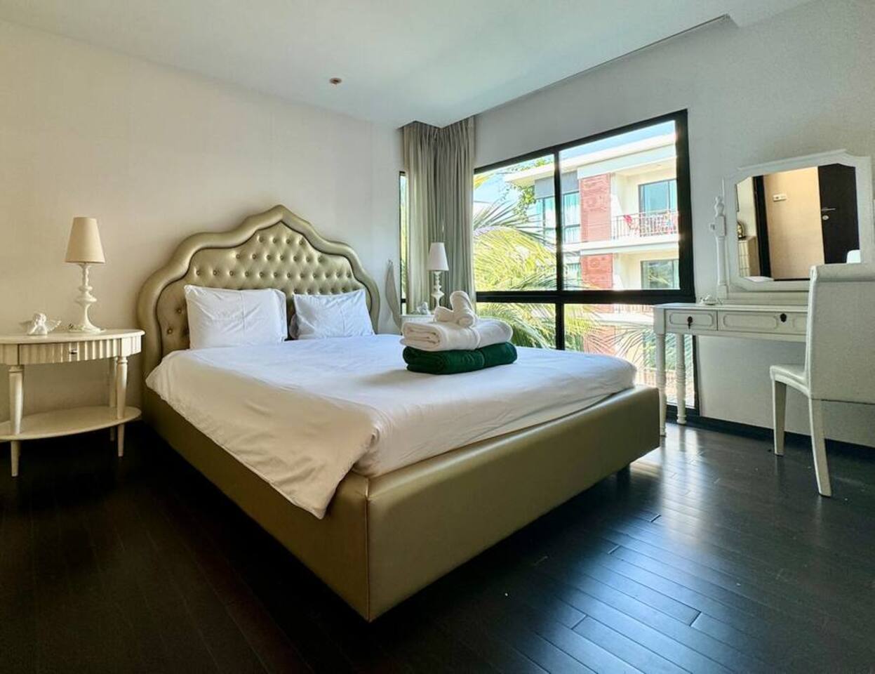 The apartment comfortably accommodates a family of four or five. The open-plan living room features a soft sofa, a Smart TV, a dining table, and a fully equipped kitchen. Both bedrooms are furnished with double beds in calm tones. The main bathroom includes a shower cabin, and there is also a guest toilet accessible from the living area. A spacious terrace with outdoor furniture is perfect for enjoying morning coffee or a glass of wine in the evening while overlooking the pool and gardens. A washing machine is also provided. The apartment is well-maintained, decorated with art pieces in Thai style, and furnished with quality items, creating a welcoming and homely space.