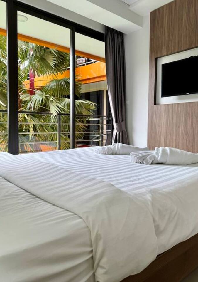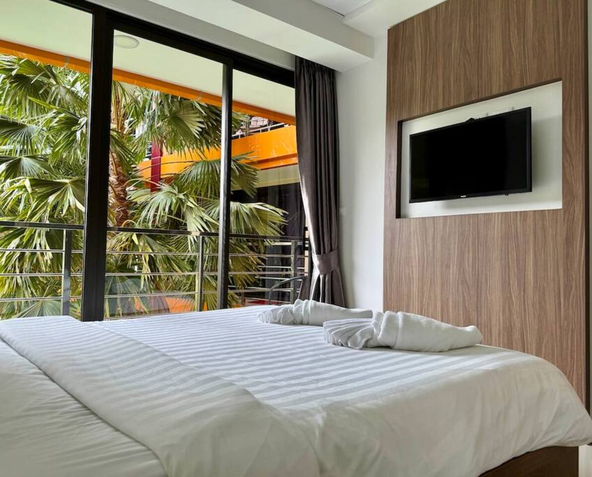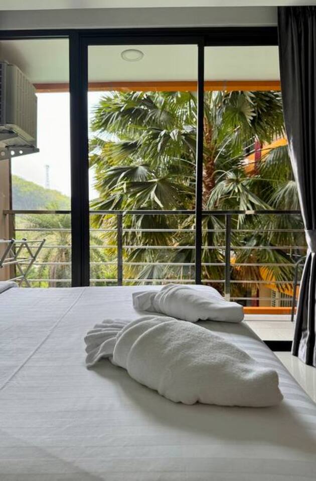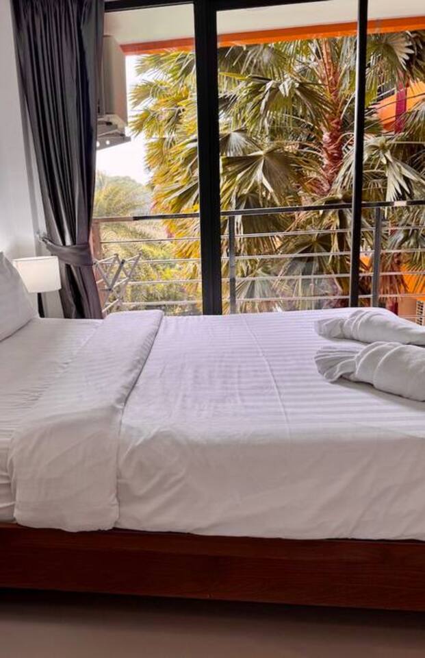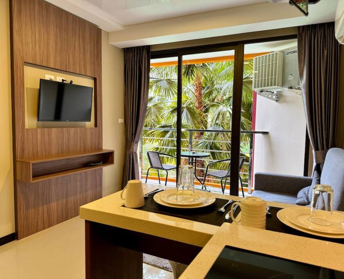 The name Sirin comes from a beautiful Thai female name meaning “bright stream”, “graceful and kind”, and “blessed calm”. It reflects the peaceful, harmonious atmosphere of the space, filled with soft light and views that inspire and uplift. The apartment features: • Living room with a fold-out sofa, bar counter, coffee table, and Smart TV • Fully equipped modern kitchen with stove, microwave, refrigerator, kettle, and utensils • Bedroom with a double bed, wardrobe, and a second TV • Spacious bathroom • Balcony with outdoor furniture, overlooking the pool and mountains • Washing machine and air conditioner • Wi-Fi and personal safe On-site facilities include a gym, outdoor pool, parking, 24/7 security, and CCTV. Next door and within the complex: restaurants, minimart, fruit stall, laundry service, and massage salon.