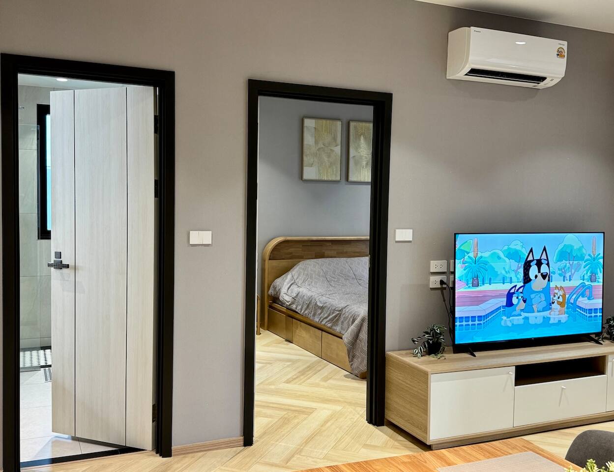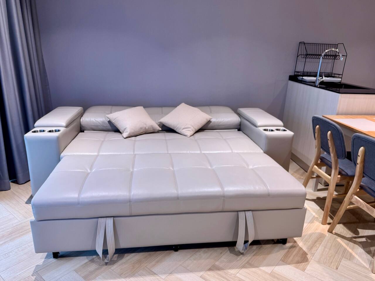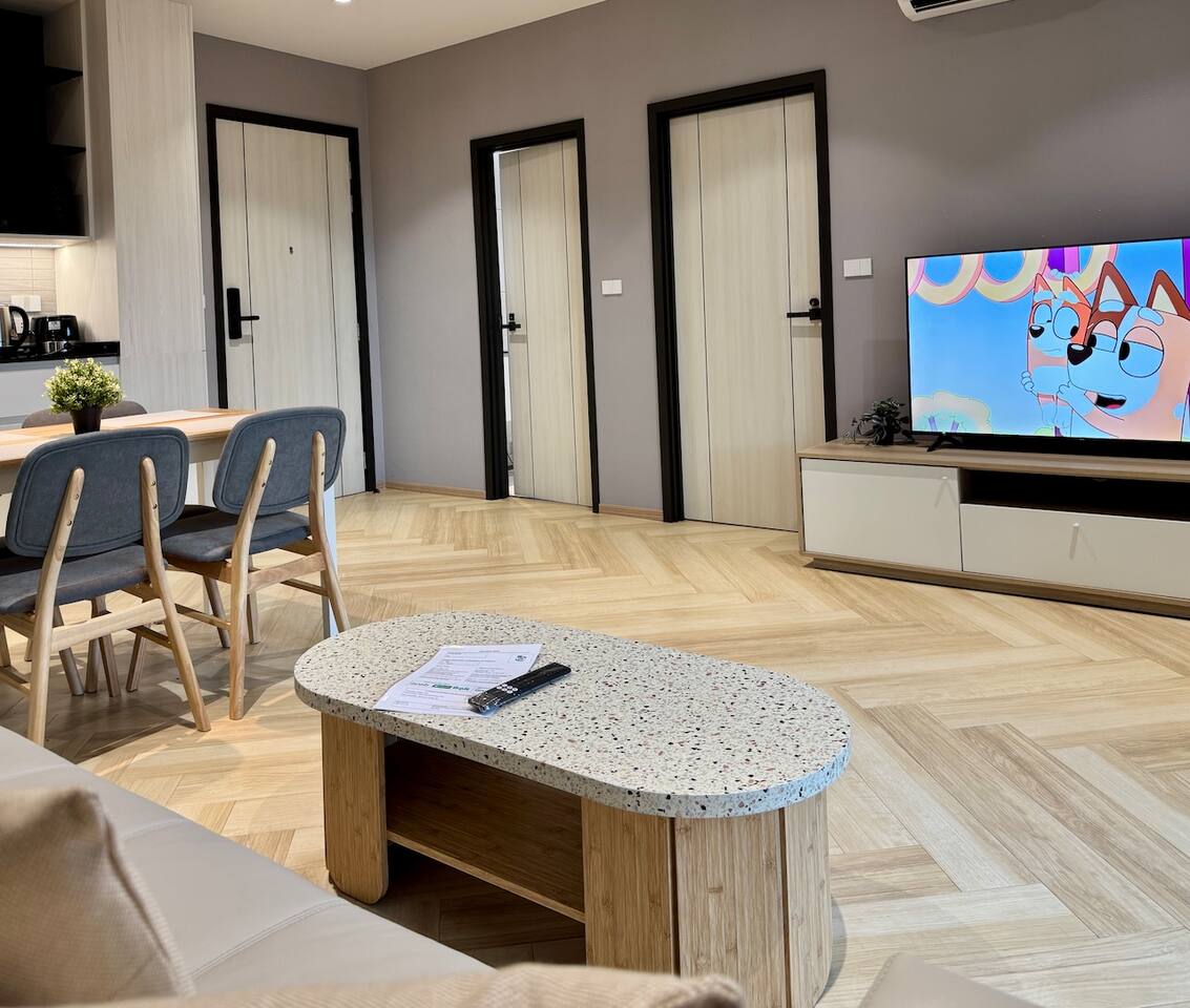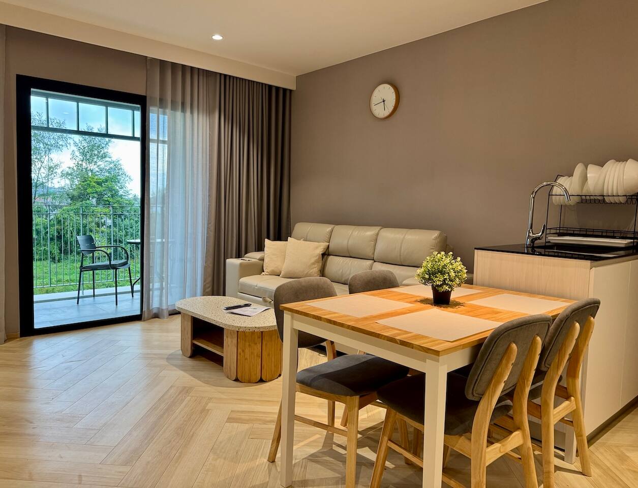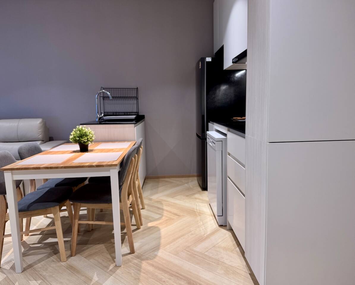 Апартаменты состоят из отдельной спальни, гостиной с выходом на балкон и полностью оборудованной кухни. В гостиной — большой раскладной диван, Smart TV, кофейный столик и обеденная зона. Кухня оснащена современной техникой: варочная панель, холодильник, микроволновая печь, посудомоечная машина и чайник. В спальне установлена двуспальная кровать king size, гардероб и сейф. Ванная комната оборудована душем и современными удобствами. С балкона открывается живописный вид на горы, установлена уличная мебель. Для удобства гостей — стиральная машина и отдельный Wi-Fi.